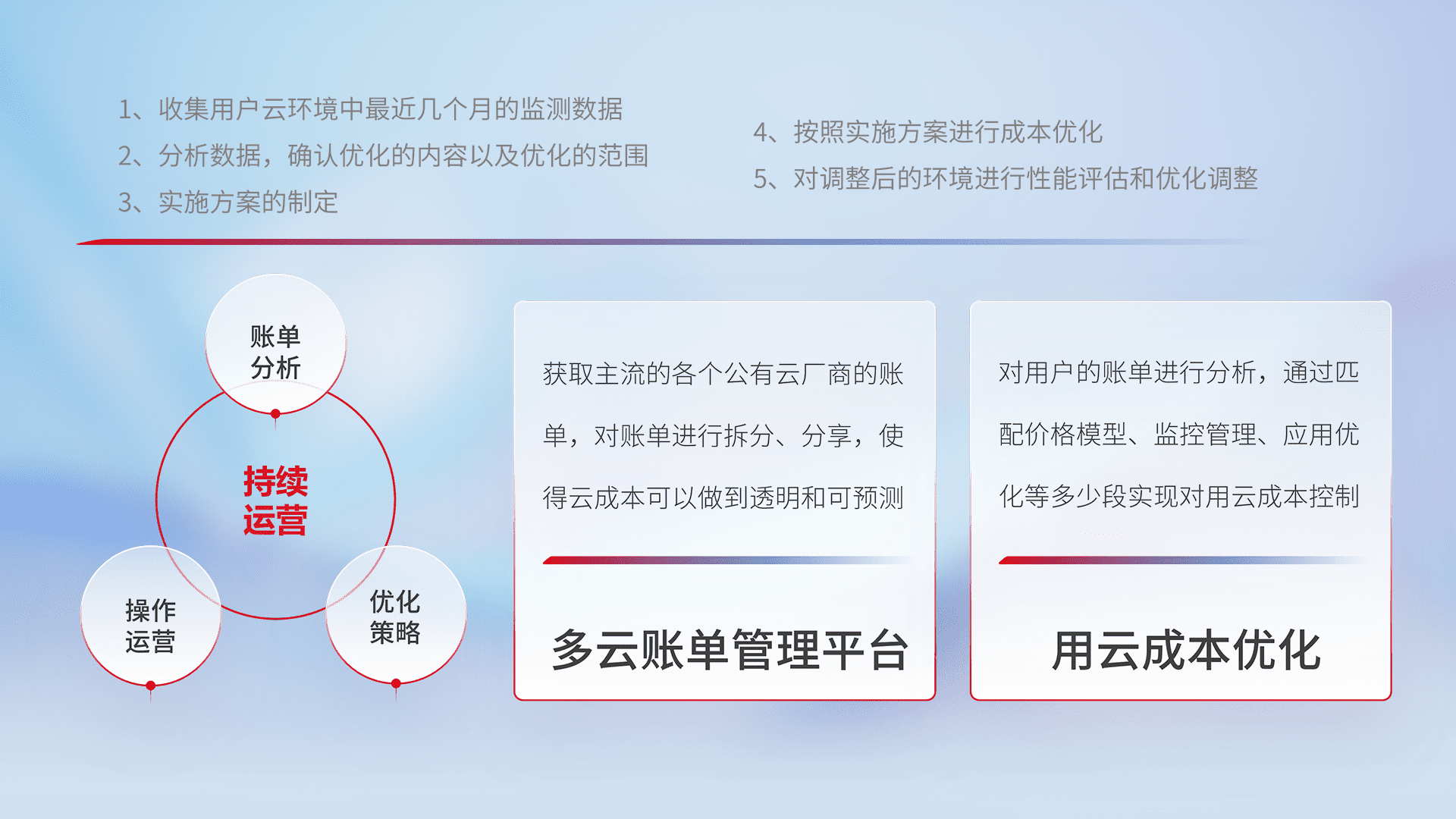 通过多云纳管,,,以统一的资源数据模型把客户的云资源进行抽象和封装,,,,进而实现对多云资源的统一操作,,,保障云资源管理的可靠性、、、稳定性与可用性。。量身定制化运维内容,,,,配置、、、、开发运维、、补丁管理、、、备份、、、监控、、、认证和访问管理、、、审计和日常巡检等,,保障在用云过程中的可靠度,,,稳定度以及高可用率。。。