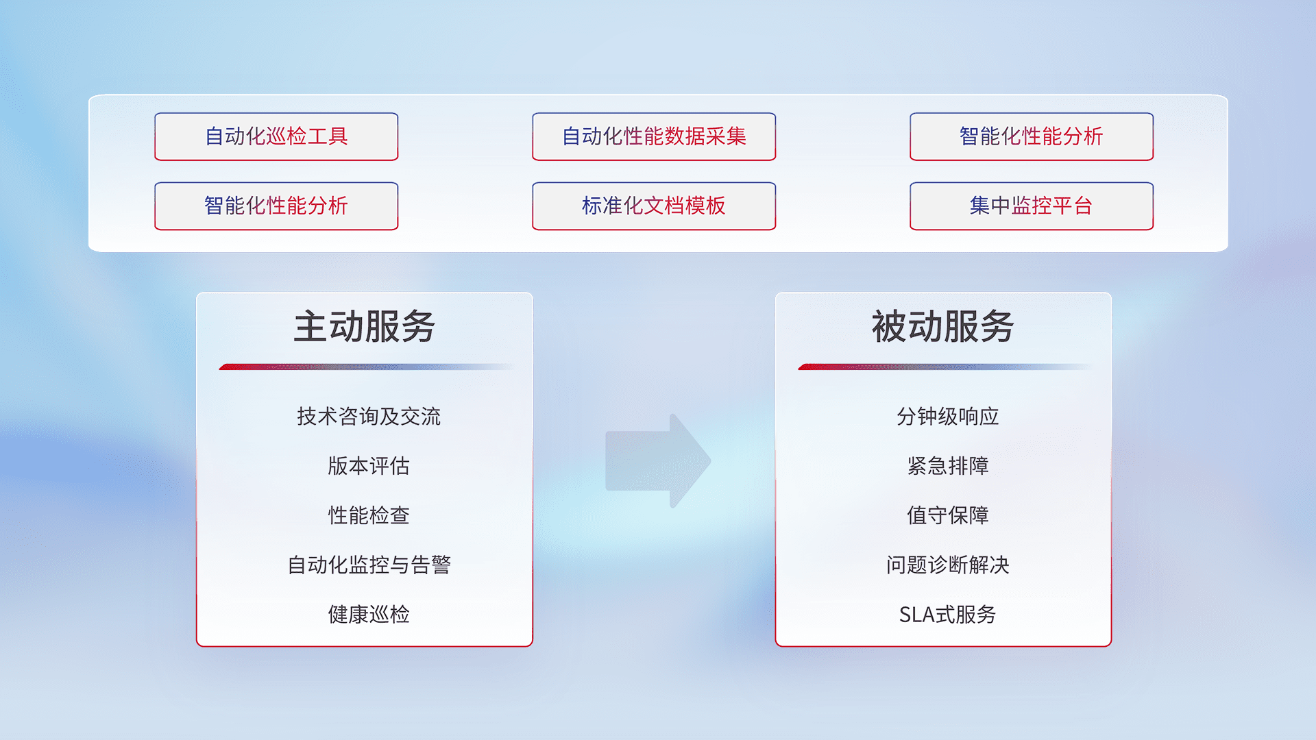 智能化工具和标准化文档,,,保障服务质量,,,提供主动服务(包含技术咨询、、、、版本评估、、、性能检查、、自动化监控与告警、、、健康巡检)和被动服务包含(分钟级响应、、、、紧急排障、、值守保障、、问题诊断解决、、、SLA服务)。。。。